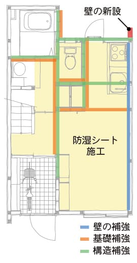 F様邸は経年の劣化が見られ、これから長く住むためには大幅な補強が必要でした。 長屋住宅では通常の建物のように外部からの補強はできないため、内側から可能な限り補強を行います。 図のような計画の元、基礎や構造、壁などの補強計画を立てました。