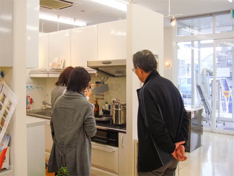 今回、水まわり設備を刷新するため、インテリアコーディネーターがショールームにご一緒しました。 お風呂やキッチンは、ショールームで実際に見た方が、実際の使い勝手もわかりやすいものです。 ショールームのスタッフに詳しく説明してもらい、F様のご希望に合う設備に決まりました。