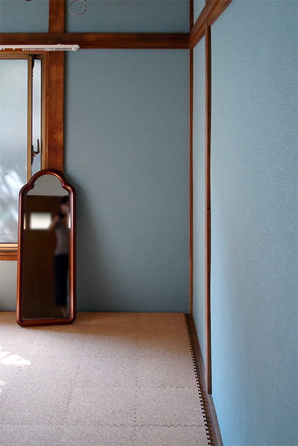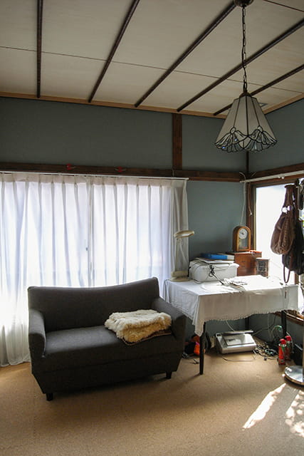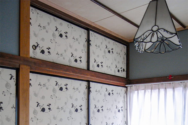 落ち着いたブルーのクロスや、モノトーンの柄の襖紙、ステンドグラス風の照明など、K様が選ばれたインテリアはどれも真壁のお部屋と相性抜群です。 古い木造住宅ならではの、レトロでモダンなお部屋を実現しました。