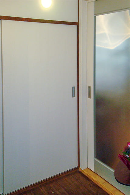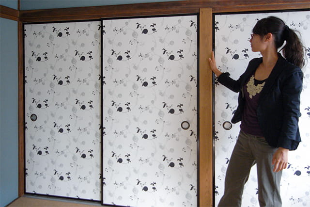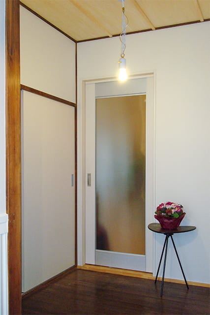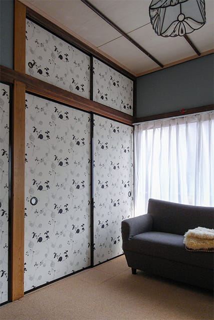また、お部屋に入る引き戸にも玉紙を張りました。裏側はモノトーン柄の襖になっていて、特注であつらえた建具です。