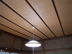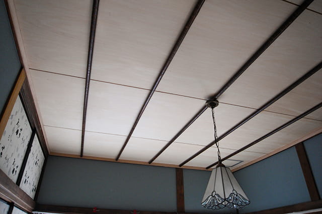 天井は、雰囲気のある竿縁(さおぶち)天井です。 竿縁は建築当時のものを再利用し、天井板は交換して、雰囲気はそのまま明るい天井になりました。 天井が明るくなると、お部屋自体も明るく感じられますね。