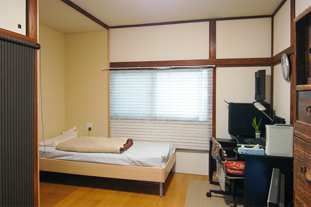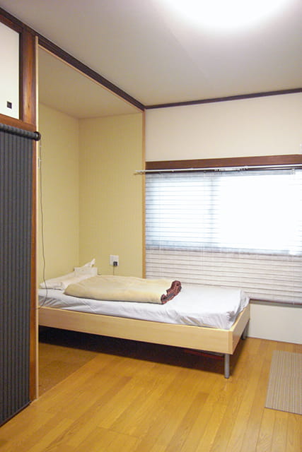 もう一つのお部屋は少し雰囲気を変え、和洋折衷のインテリアにしました。ベッドを置いて、明るい寝室となっています。