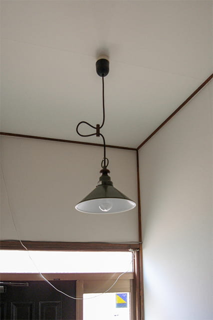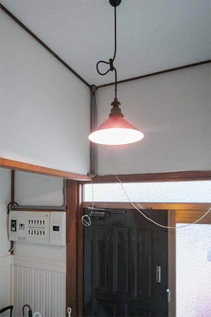 照明は、K様がお選びになったレトロなペンダント照明に替えました。 一歩入ると、どこか懐かしく、暖かな気持ちになれる玄関です。