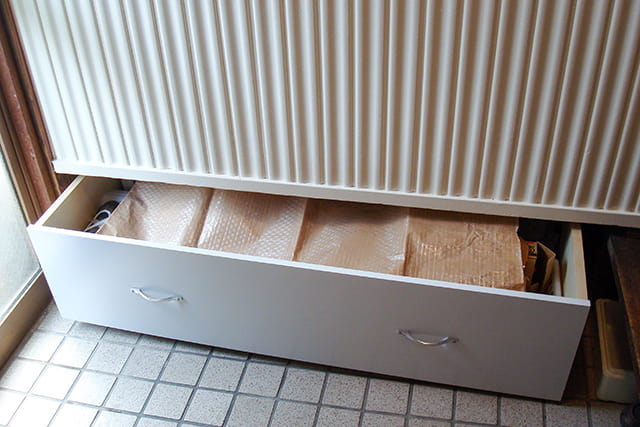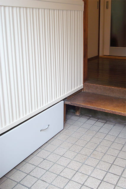 さらに、腰壁のしたにスペースを設け、便利な引出し収納を設置しました。 玄関まわりのものをスッキリ収納するのにぴったりのサイズです。