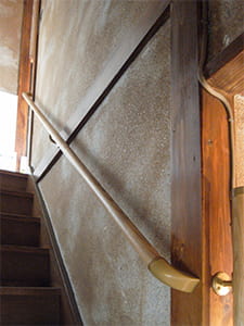 壁は玄関と同じように、じゅらく壁から和紙壁紙・玉紙に変わりました。 白い壁紙で明るくなった中に、玉紙の微妙なデコボコがニュアンスを生み出しています。 木部の色合いとマッチして、落ち着いた雰囲気の階段になりました。