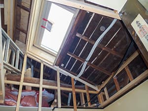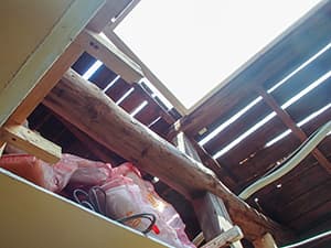 S様邸は都心の住宅密集地にあり、両隣からの採光がほとんど望めません。 そこで、屋根の葺き替えと合わせて、天窓を設置することにしました。