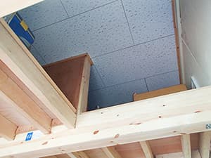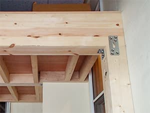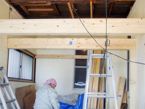 ガレージの中央付近の2箇所に大きな梁をかけて、新しく柱を立てて梁を支えます。 大きな空洞になっていた空間に梁と柱を追加することで、2階部分の重量をこれまで以上にしっかり支えることができます。