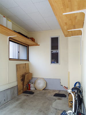 新しく梁をかけたため、高い位置にあった棚が使えなくなってしまいました。 その代わりに、ガレージ上部の空間を利用してロフト収納を設置しました。