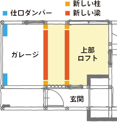 S様も車を使うためガレージが必要とのことで、ビルトインガレージの耐震補強を行うことになりました。 仕口ダンパーを設置し、新しく梁と柱を追加して補強します。