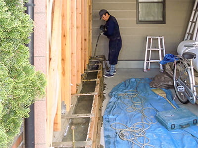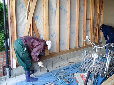 新しい基礎を施工します。コンクリートに鉄筋を打ち込むように設置し、骨組みにします。