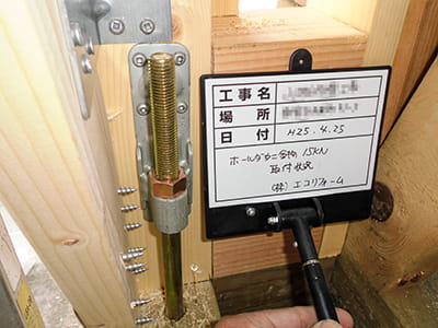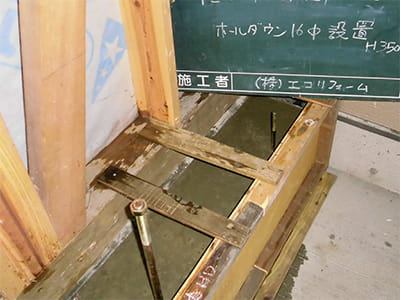 新しく設置した土台と柱をしっかり固定するために、ホールダウン金物を設置します。 ホールダウン金物は、土台と柱を固定するための耐震補強金物で、地震の揺れで柱が抜けることを防ぐ効果があります。