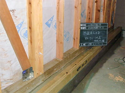 土台と柱をホールダウン金物で固定しました。ホールダウン金物は壁面の2箇所に設置しています。