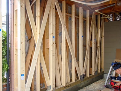 まず基礎を新設して新しい柱を立て、筋交いとホールダウン金物、構造用合板を使って耐力壁を造ります。