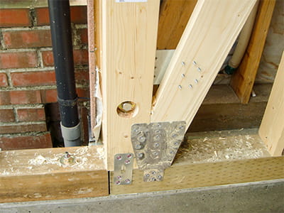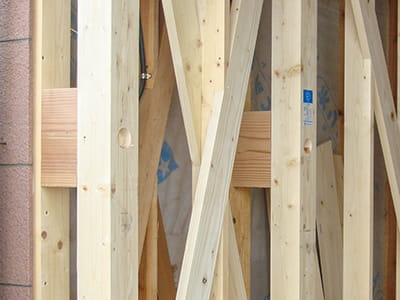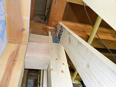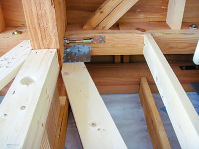 耐震金物で接合部をしっかり固定することで、地震の際に柱や筋交いが抜けてしまうのを防ぎます。