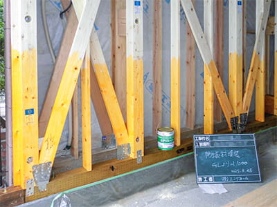 柱や筋交いにも防蟻剤を塗布しました。黄色っぽいのが防蟻剤を塗布した箇所です。