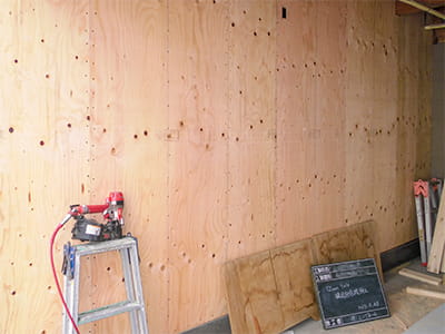 構造用合板で壁を閉じました。構造用合板は面として建物を支えるため、より強固な体力壁となります。