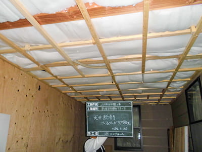 天井に断熱材のパーフェクトバリアを施工しました。2階のリビングが、冬でも快適な空間になります。