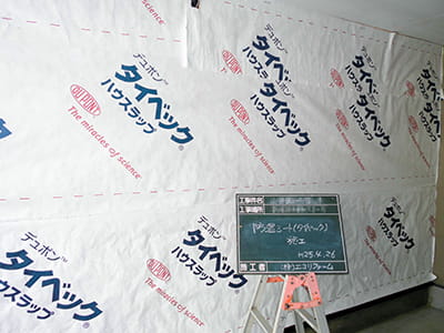 新しい耐力壁に防湿シートを張り、雨風が吹き込んだ時のダメージを防ぎます。
