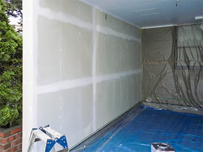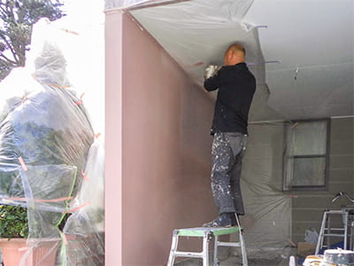 吹き付け塗装で仕上げます。補強箇所が目立ちすぎないよう、既存の壁と似た雰囲気の塗装を選びました。