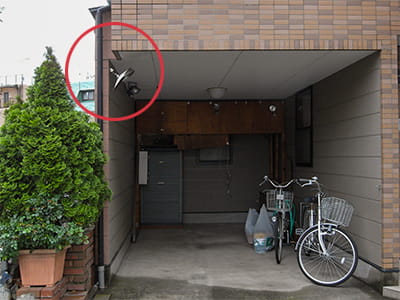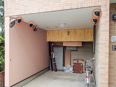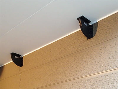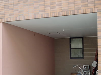 ガレージ内部の壁に仕口ダンパーを取り付けました。外装材の上から、柱と梁の交点に設置されています。