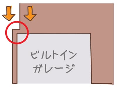 少しでも余裕を持たせるためか、ビルトインガレージの壁が、上階の壁より少し外側に立てられています。