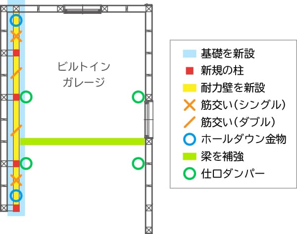 図のようにビルトインガレージを補強することで、揺れを軽減し、地震に強い建物にします。 合わせて断熱施工も行い、安全で快適なお住まいへとリフォームします。